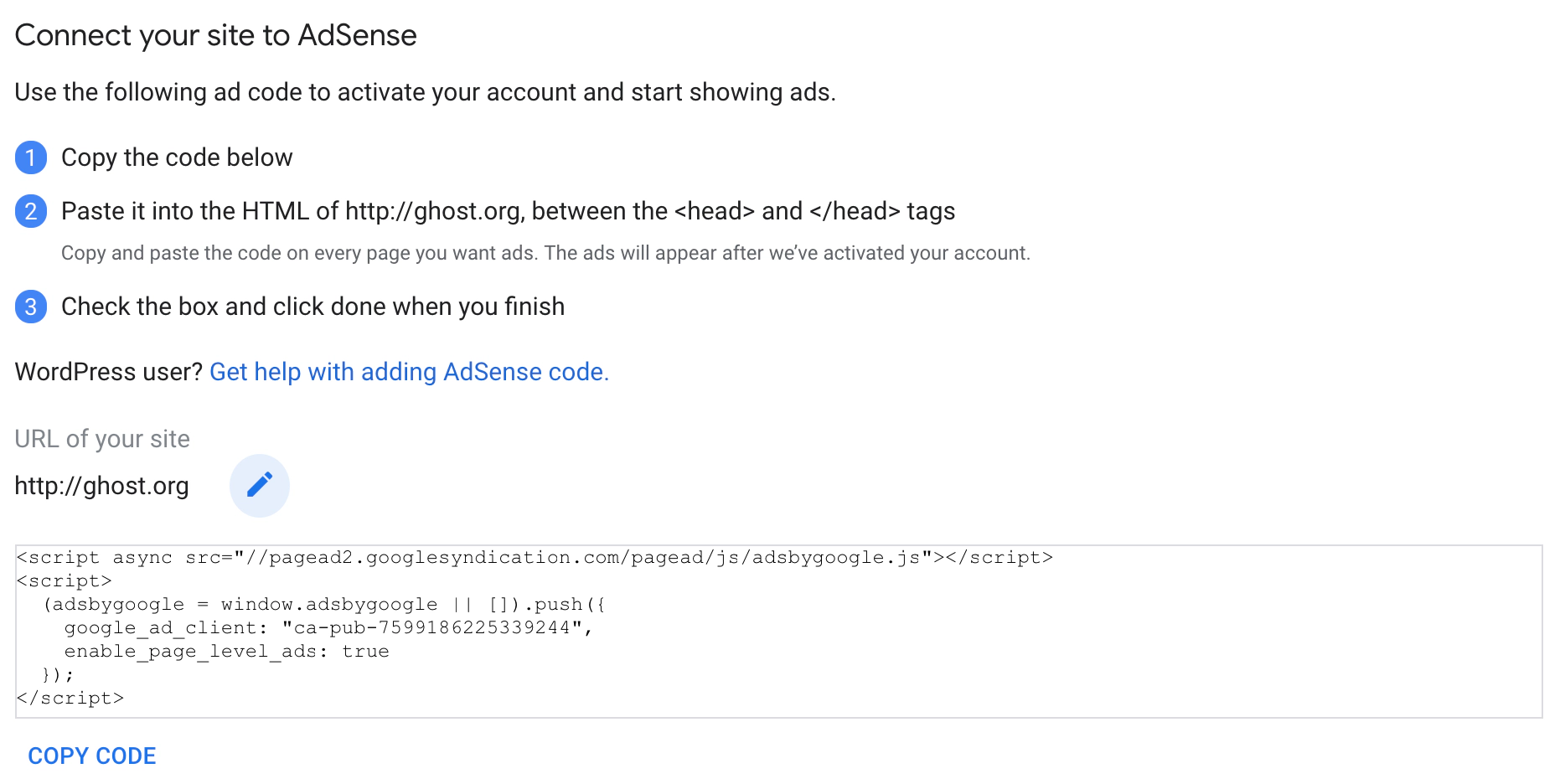 Grab the Auto ads code snippet